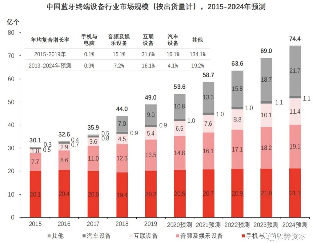 2015年至2020年期間中國藍牙終端設(shè)備出貨量穩(wěn)步提升,未來伴隨藍牙芯片在各領(lǐng)域滲透率持續(xù)提升,預(yù)計至2024年藍牙終端設(shè)備出貨量將達74.4億個。