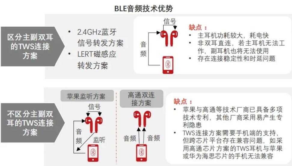 藍牙芯片的重要應用場景。早期藍牙標準不支持無線多路直連,無法實現(xiàn)雙耳同步傳輸,普通藍牙耳機僅能實現(xiàn)一對一連接,蘋果采用Snoop監(jiān)聽模式,在一只耳機進行藍牙音頻傳輸時,另一只耳機利用它們之間的私有協(xié)議對其進行監(jiān)聽,達到1對2連接的目的。由于蘋果對監(jiān)聽模式進行專利封鎖,早期安卓TWS廠商主要采用relay轉發(fā)模式,將音頻從手機傳至左耳設備,再由左耳轉發(fā)至右耳,但該方案存在諸多劣勢,例如(1)音頻傳輸過程較長造成連接不穩(wěn)定;(2)延遲問題嚴重;(3)接受音頻傳輸?shù)闹饔枚鷻C的電池功耗顯著高于輔用耳機。安卓TWS廠商受限于技術實力,TWS耳機產(chǎn)品音頻傳輸體驗亟待提升。