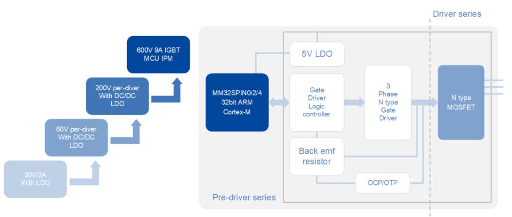 SPIN是旋轉(zhuǎn)的同義詞,再注入靈動(dòng)微電子的靈魂Mind,表示靈活與專(zhuān)業(yè)。包含了三大主軸:專(zhuān)業(yè)MCU,專(zhuān)用驅(qū)動(dòng)MCU微控制器及解決方案平臺(tái)。專(zhuān)用MCU的獨(dú)特之處是帶領(lǐng)了許多主流應(yīng)用,如:電動(dòng)車(chē)的應(yīng)用,目前市場(chǎng)的占有率仍然保持領(lǐng)先地位;專(zhuān)用驅(qū)動(dòng)型MCU微控制器電壓范圍從20V至600V。例:MM32SPIN222C集成了三相MOSFET、預(yù)驅(qū)以及LDO,可讓小空間發(fā)揮最大的功能,同時(shí)內(nèi)建了高性能32位的Arm Cortex-M0內(nèi)核為運(yùn)算核心,讓開(kāi)發(fā)更為簡(jiǎn)單快捷;解決方案平臺(tái)由擁有超過(guò)10年以上算法開(kāi)發(fā)經(jīng)驗(yàn)的MindSPIN團(tuán)隊(duì)精心打造,按技術(shù)方式分為方波、旋波FOC以及位置控制三類(lèi),按應(yīng)用方式可分為風(fēng)機(jī)、電動(dòng)工具、微電機(jī)、家電以及電動(dòng)車(chē)五大類(lèi),同時(shí)靈動(dòng)微電子還提供了不同的相對(duì)應(yīng)的特色