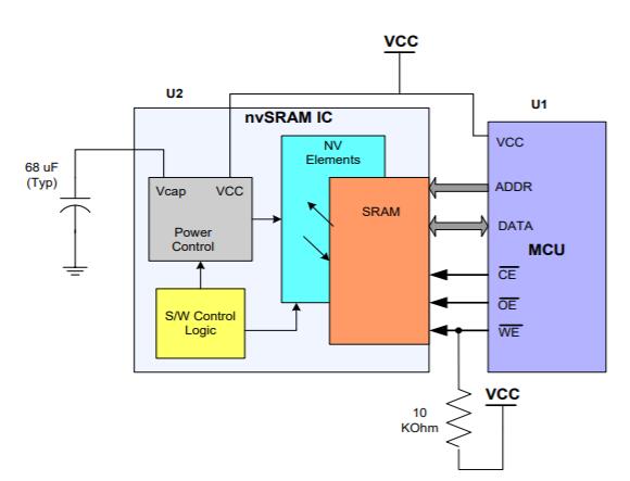 高速SRAM單元提供了非常高速的讀寫訪問,并且可以像標(biāo)準(zhǔn)SRAM中一樣無限次地寫入或讀取NV-SRAM。如果斷電則利用存儲在與NV-SRAM的VCAP引腳相連的小電容器中的電荷將SRAM中保存的數(shù)據(jù)傳輸?shù)脚c每個SRAM單元集成的非易失性元件。 NV-SRAM VCAP引腳上需要的電容器只有幾十µF,典型值為68 µF(有關(guān)VCAP的允許范圍,并在上電期間通過內(nèi)部充電電路進(jìn)行充電。 VCAP上存儲的電荷足以在掉電期間將SRAM數(shù)據(jù)復(fù)制到非易失性元件(稱為存儲操作)。