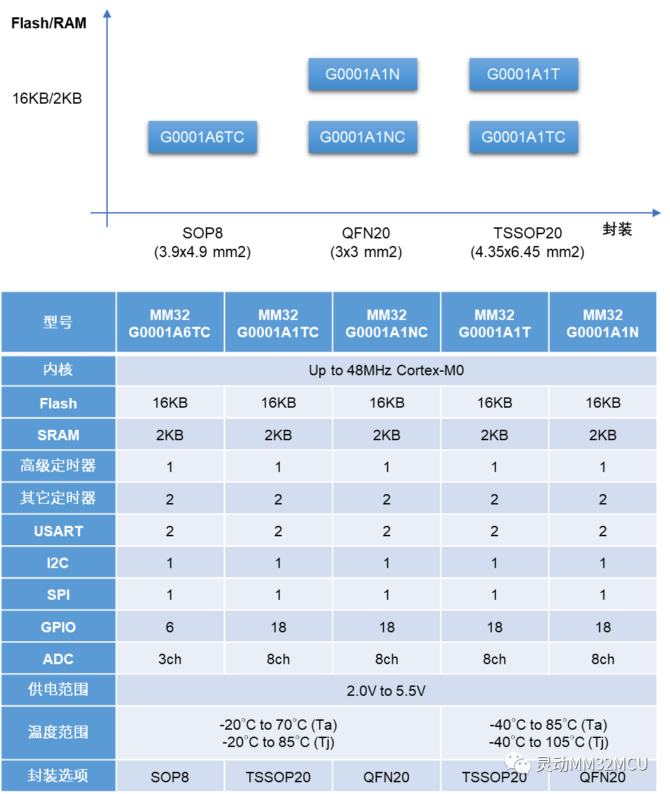 MM32G0001提供TSSOP20,QFN20和SOP8三種封裝,提供-40~85℃工業(yè)級(jí)和-20~70℃消費(fèi)級(jí)環(huán)境溫度選項(xiàng),共推出5款型號(hào)可供選擇。支持為特定客戶和應(yīng)用定制DFN、DIP和SOP等常見的小引腳封裝。