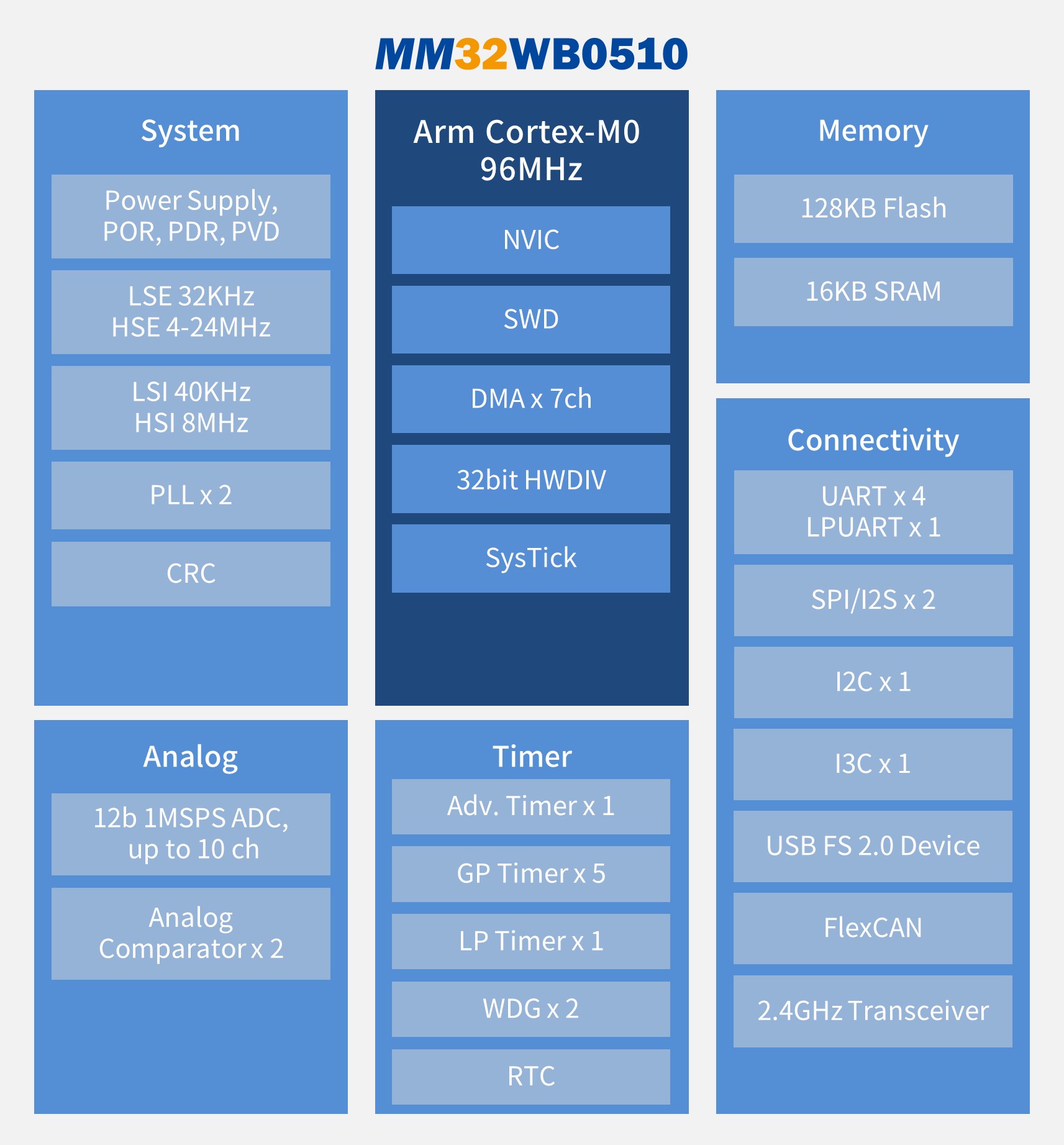 MM32WB0510搭載Arm Cortex-M0內(nèi)核,主頻可達96MHz,內(nèi)置128KB Flash和16KB SRAM,并集成了USB和FlexCAN接口,面向智能家居,鍵鼠,消防現(xiàn)場部件,電力電子,汽車OBU,汽車傳感器等無線和多接口類型的應(yīng)用。可選封裝形式包括:LQFP64,LQFP48,QFN48和QFN32。