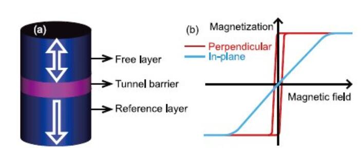 因此,對于相同的熱穩定性勢壘,垂直磁各向異性能夠使磁隧道結的臨界翻轉電流比面內磁各向異性的更低,相應地,自旋轉移矩的翻轉效率更高。鑒于上述優勢,研究人員也一直致力于采用垂直磁各向異性的磁隧道結結構建高密度、低功耗的pSTT-MRAM。