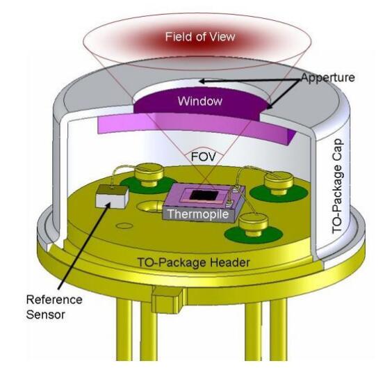 一般采用金屬外殼封裝,物料的紅外射線經(jīng)過表面的濾光片進(jìn)入到里面的熱電堆電偶上,再經(jīng)過信號感應(yīng)轉(zhuǎn)換成電信號。