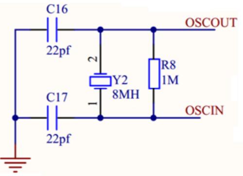外部無源晶振電路如下圖所示,晶振兩腳接約 22pf 電容,并上 1M 反饋電阻。因芯片內(nèi)部沒有集成反饋電阻,為保證 XTAL 起振,必須接 1M 歐姆電阻;