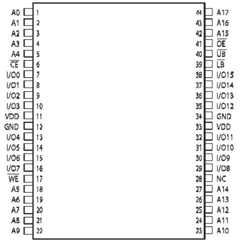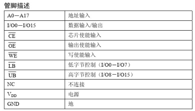 芯片使能輸入CE和輸出使能輸入OE可方便實現存儲器的擴展。低電平有效的寫使能( WE )控制著存儲器的寫和讀操作。高字節(jié)(UB)和低字節(jié)(LB )控制信號控制著對數據字節(jié)的訪問。