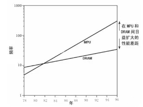 芯片集成度的不斷提升,給分立存儲器帶來了兩大挑戰(zhàn):首先:集成度和工藝開始允許片內(nèi)集成更多的存儲器;其次,存儲器的速度發(fā)展遠遠趕不上于MPU的速度,MPU速度以每年60%在成長,而存儲器只有10%。二者速度之間增長的差異巨大,如下圖所示。