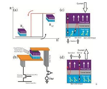 在讀操作方面,磁隨機存儲器一般基于隧穿磁阻效應,在鐵磁層1/絕緣層/鐵磁層2三層結構中,當兩層鐵磁層磁化方向相同時,器件呈現“低電阻狀態”,當兩層鐵磁層磁化方向相反時,器件呈現“高電阻狀態”,且兩個狀態可以相互轉化(如圖2);在寫操作方面,基于自旋轉移矩效應,器件處于高阻態時,通自上而下的電流,反射的自旋多態電子會翻轉易翻轉層磁化方向,器件由低阻態變為高阻態;器件處于低阻態時,通自下而上的電流,隧穿的自旋多態電子會翻轉易翻轉層磁化方向,器件由高阻態變為低阻態。自旋轉移矩效應已被驗證可實現1納秒以下的寫操作。