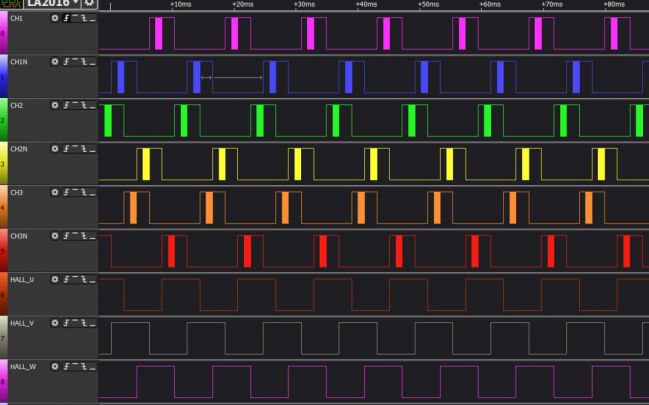 每次PWM換相后都會持續(xù)輸出一段有效電平,等到電流恢復(fù)后PWM波形恢復(fù)正常。